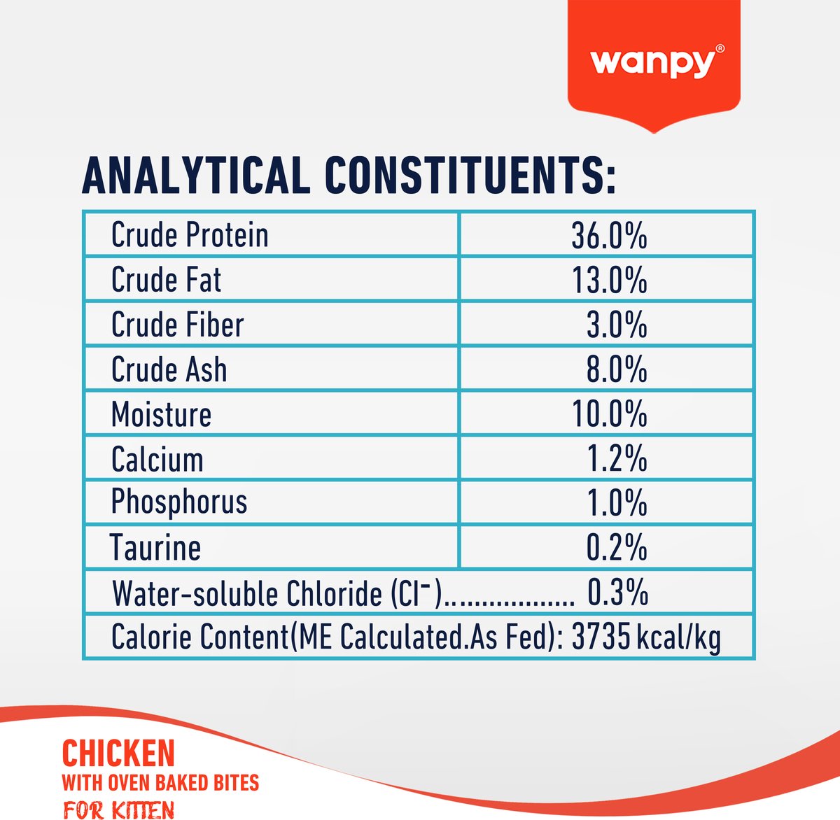 Additifs : T aurine, acétate de vitamine A, vitamines (B1, B2, B6, B12, D3), acétate de DL-α-tocophéryle (vitamine E), vitamine C, bisulfite de nicotinamide de ménadione, D-biotine, niacinamide, D-pantothénate de calcium, acide folique, sulfate de zinc, sulfate de cuivre, sulfate ferreux, sulfate de lysine de manganèse, iodate de calcium, sélénite de sodium, extrait de poisson hydrolysé, farine de poulet hydrolysée, antioxydants, chlorure de choline, probiotiques (Lactobacillus acidophilus, inactivé 18,0 × 10⁹ UFC/kg – source de bouchées cuites au four).